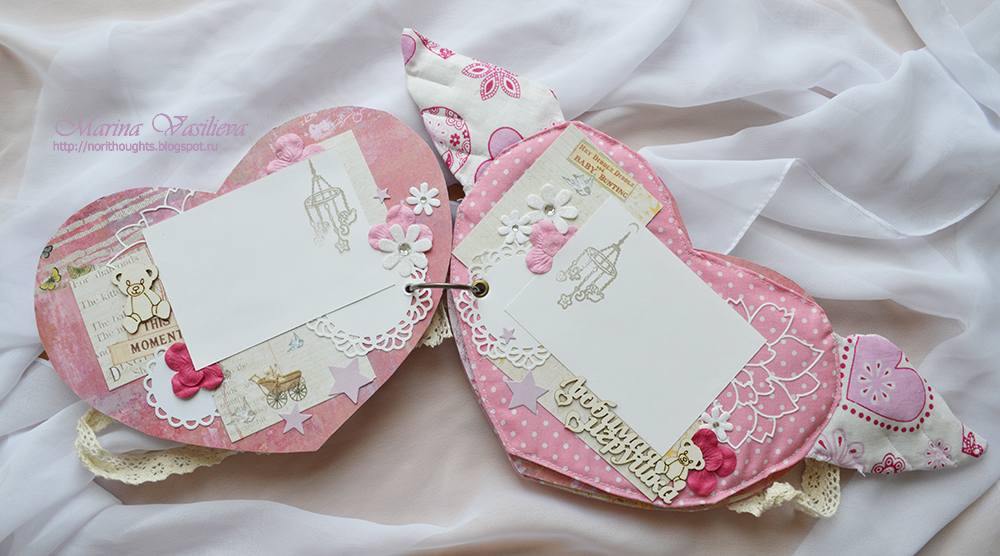После получения набора сразу пришла идея детского миник, её продиктовал чипборд и карточки из набора. Бумага в наборе очень нежная, розовая, практически, зефирная и поэтому я решила сделать девчачий миник в форме сердца с маленькими крылышками :)